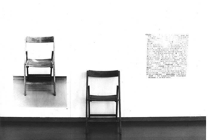 As a manufactured chair, as a photograph, and as a copy of a dictionary entry for the word "chair."the installation is thus composed of an object, an image, and words. . Chair 32 3/8 x 14 7/8 x 20 7/8 (82 x 37.8 x 53 cm), photographic panel 36 x 24 1/8 (91.5 x 61.1 cm), text panel 24 x 30 (61 x 76.2 cm).